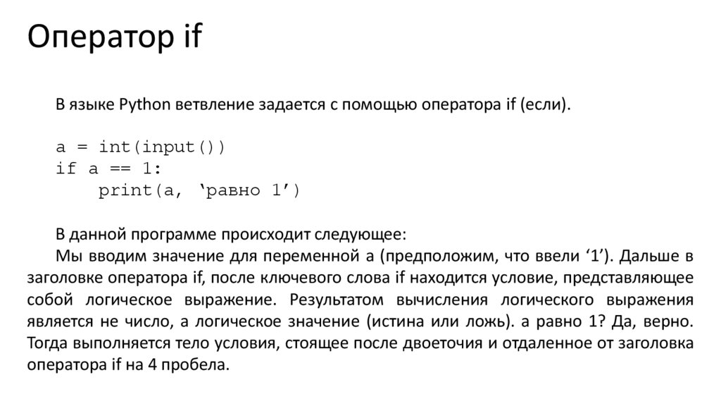 Тогда выполняется тело условия, стоящее после двоеточия и отдаленное от заголовка