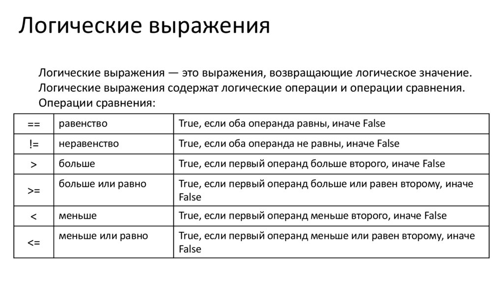 Логические выраженияЛогические выражения — это выражения, возвращающие логическое значение.