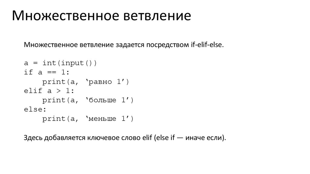 Множественное ветвлениеМножественное ветвление задается посредством if-elif-else.