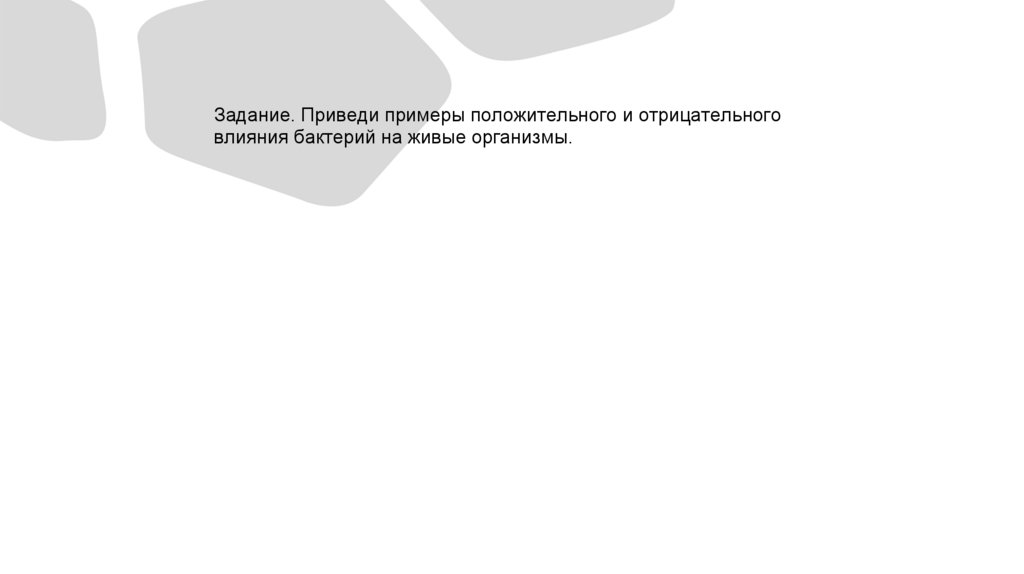 Задание. Приведи примеры положительного и отрицательноговлияния бактерий на живые организмы.