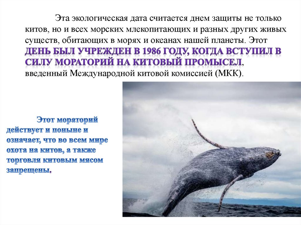 Эта экологическая дата считается днем защиты не толькокитов, но и всех морских млекопитающих и разных других живых