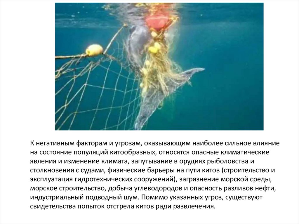 К негативным факторам и угрозам, оказывающим наиболее сильное влияниена состояние популяций китообразных, относятся опасные климатические