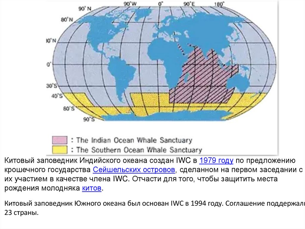Китовый заповедник Индийского океана создан IWC в 1979 году по предложениюкрошечного государства Сейшельских островов, сделанном на первом заседании с