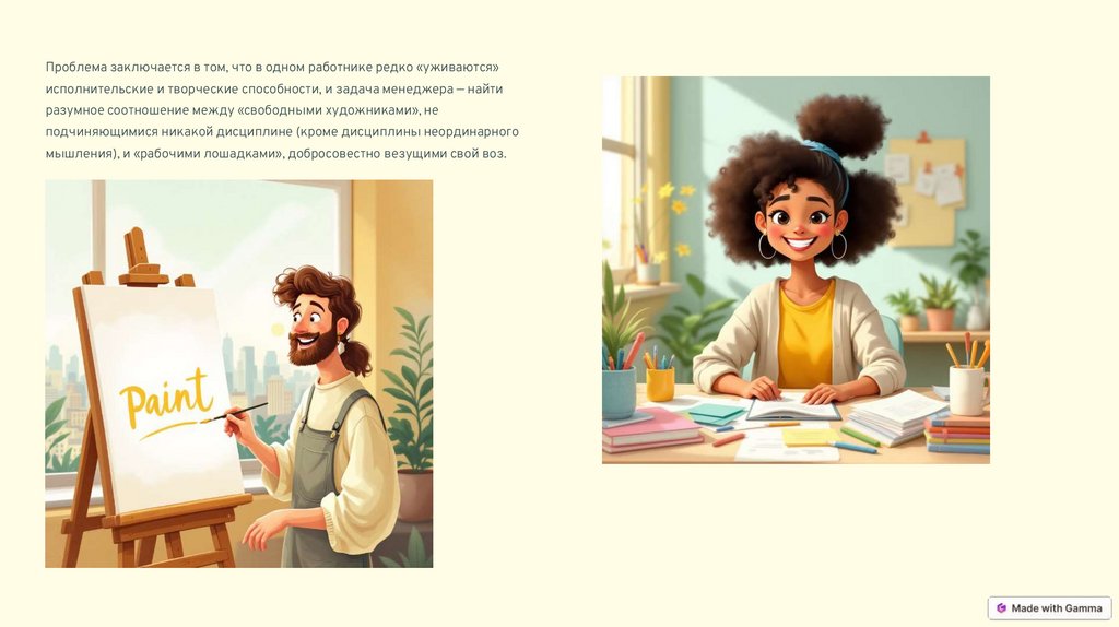 Проблема заключается в том, что в одном работнике редко «уживаются»исполнительские и творческие способности, и задача менеджера — найти