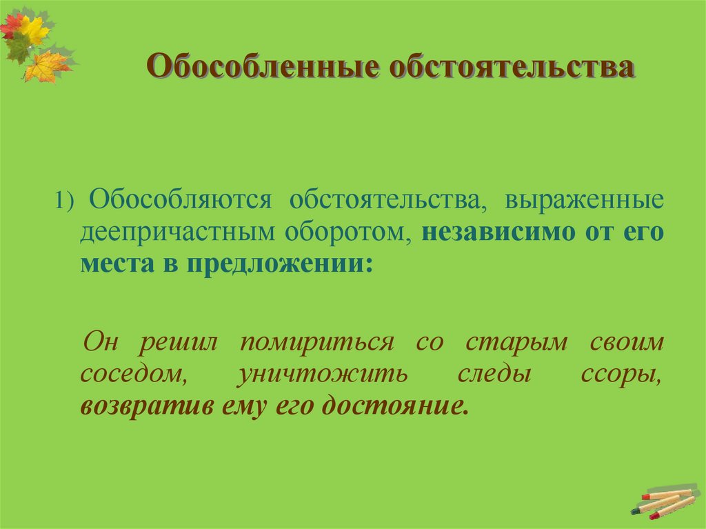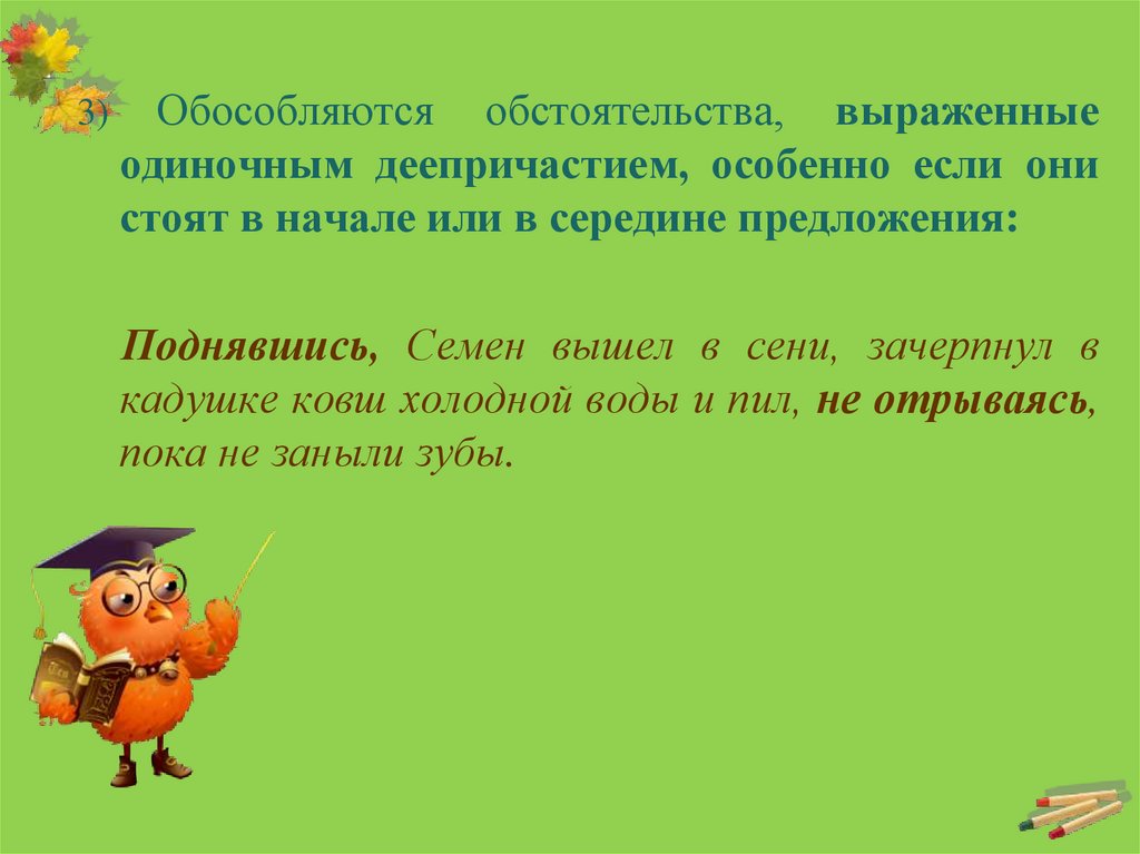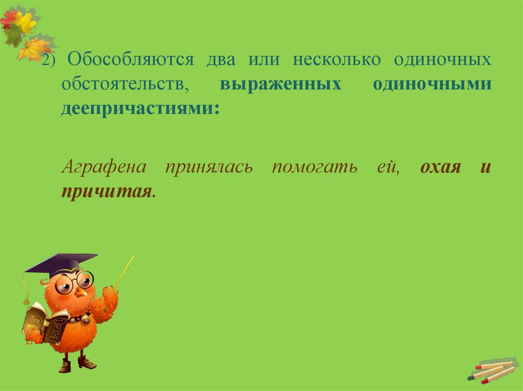 1) Обособляются обстоятельства, выраженныедеепричастным оборотом, независимо от его