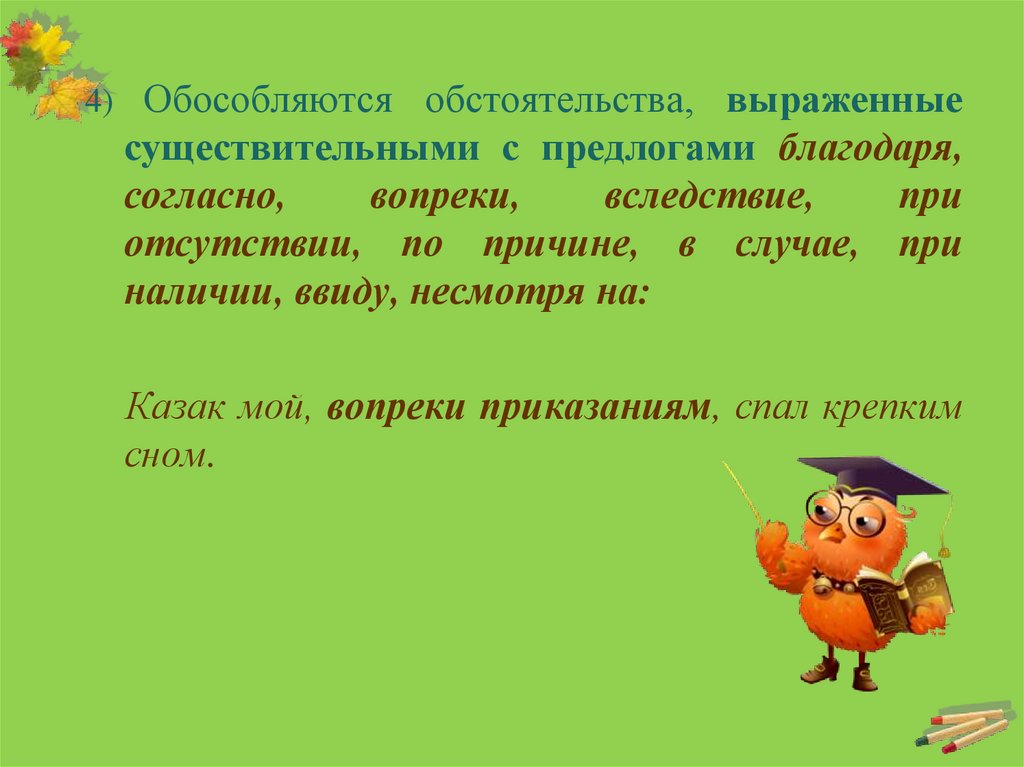 4) Обособляются обстоятельства, выраженныесуществительными с предлогами благодаря,