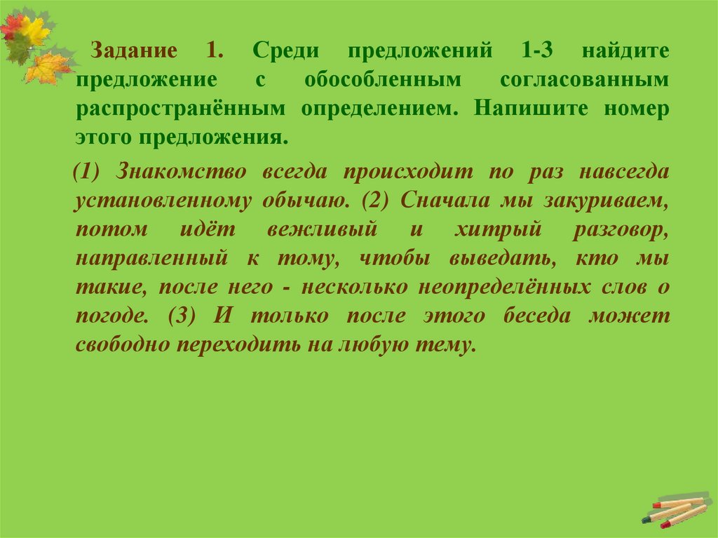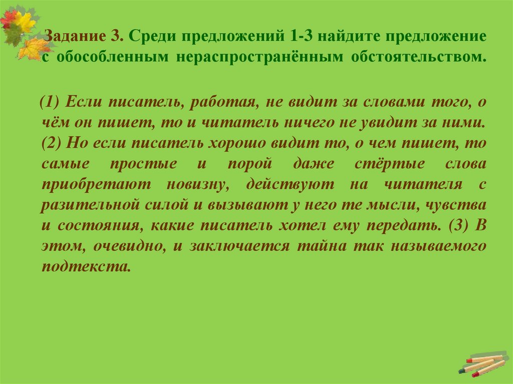 Задание 3. Среди предложений 1-3 найдите предложениес обособленным нераспространённым обстоятельством.