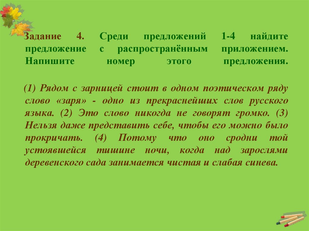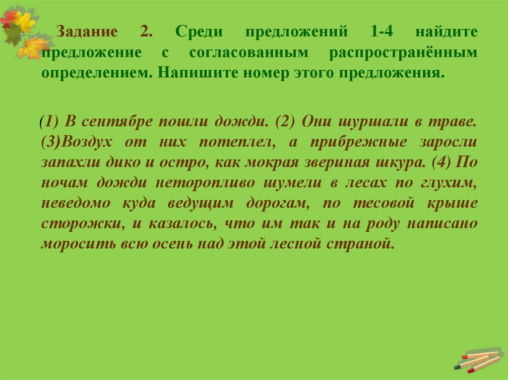 Задание 2. Среди предложений 1-4 найдитепредложение с согласованным распространённым