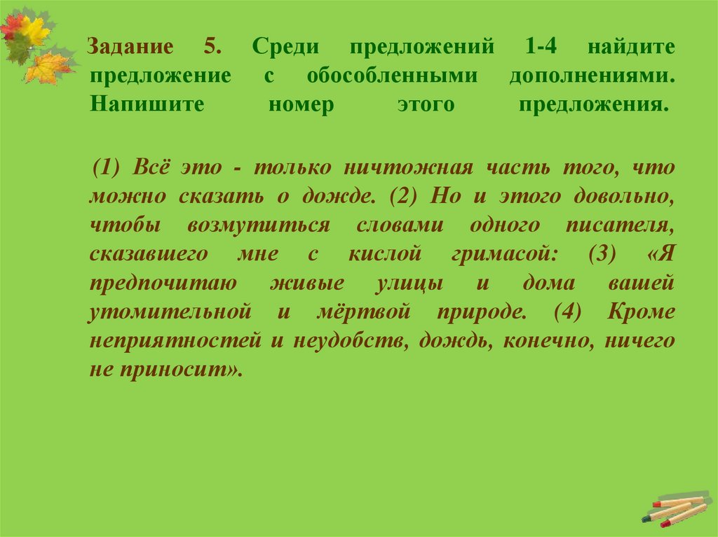 Задание 5. Среди предложений 1-4 найдитепредложение с обособленными дополнениями.