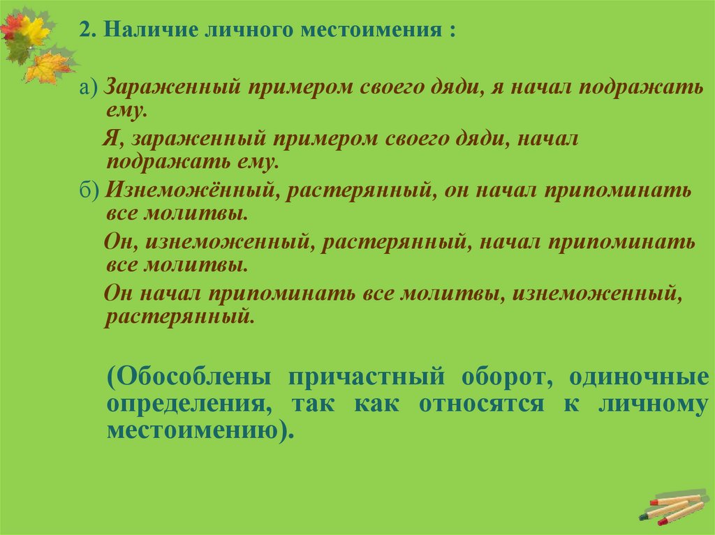 2. Наличие личного местоимения :а) Зараженный примером своего дяди, я начал подражать