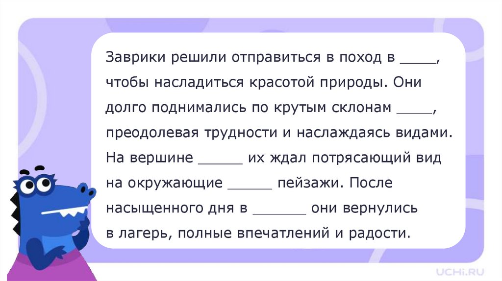 Заврики решили отправиться в поход в ____,чтобы насладиться красотой природы. Они