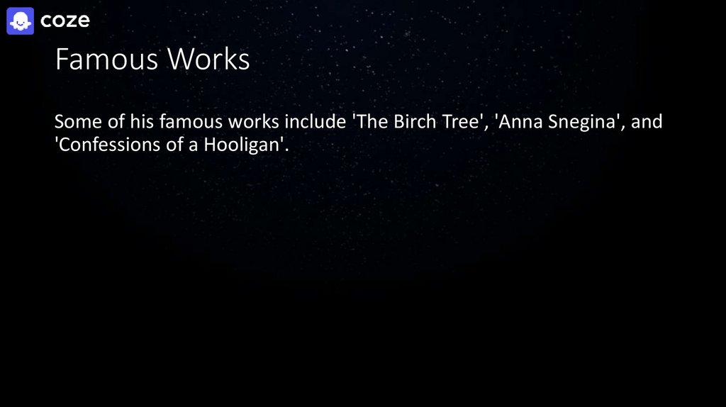 Famous WorksSome of his famous works include 'The Birch Tree', 'Anna Snegina', and