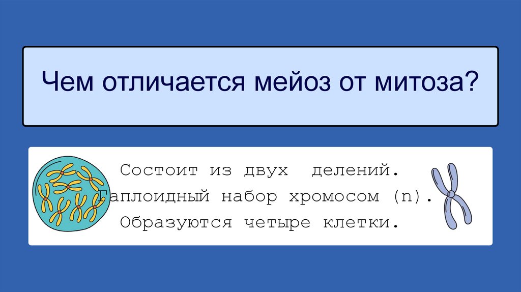 Чем отличается мейоз от митоза?Состоит из двух делений.