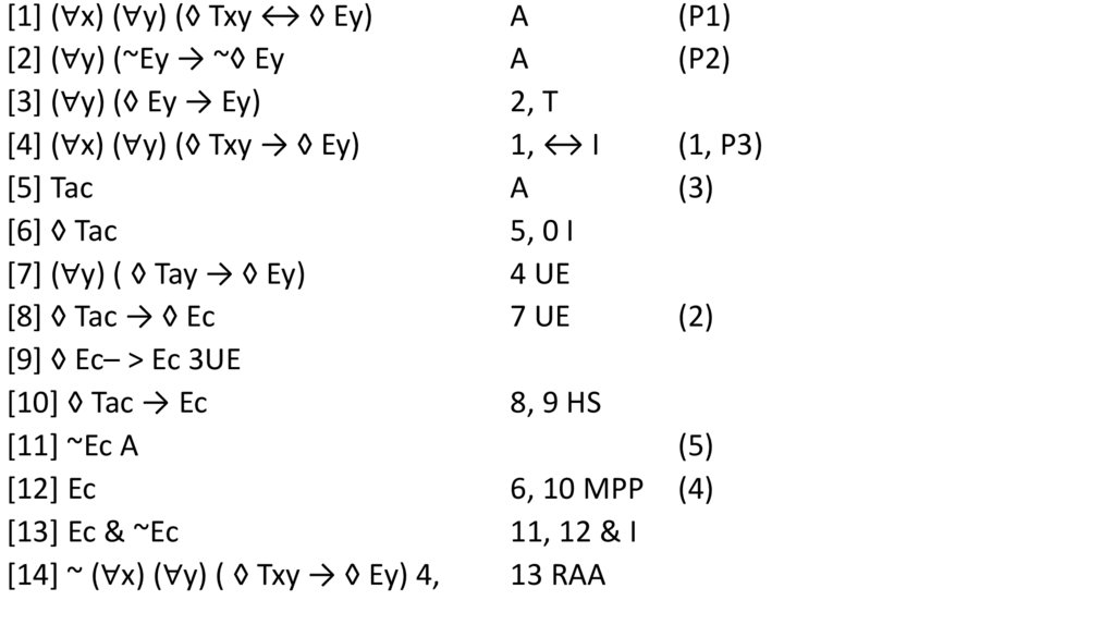[1] (∀x) (∀y) (◊ Txy ↔ ◊ Ey)[2] (∀у) (~Ey → ~◊ Eу