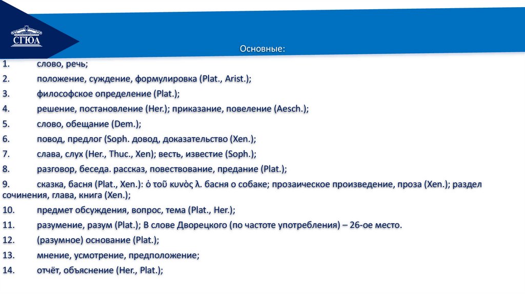 разумение, разум (Plat.); В слове Дворецкого (по частоте употребления) – 26-ое место.