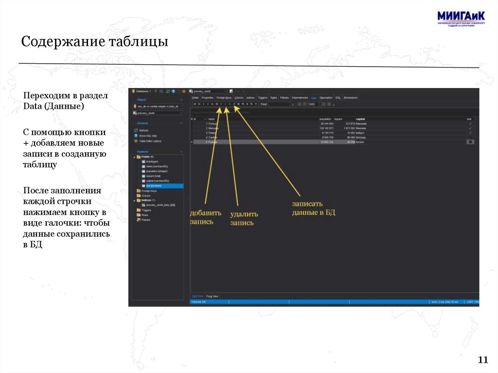 Содержание таблицыПереходим в раздел
