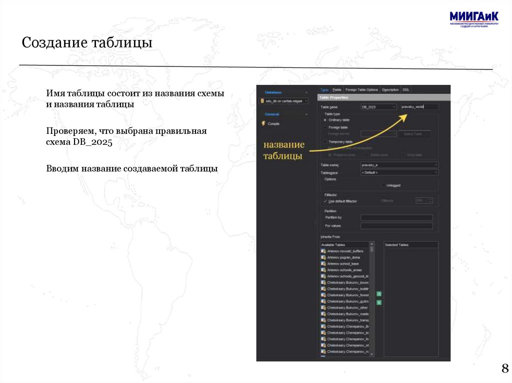Создание таблицыИмя таблицы состоит из названия схемы
