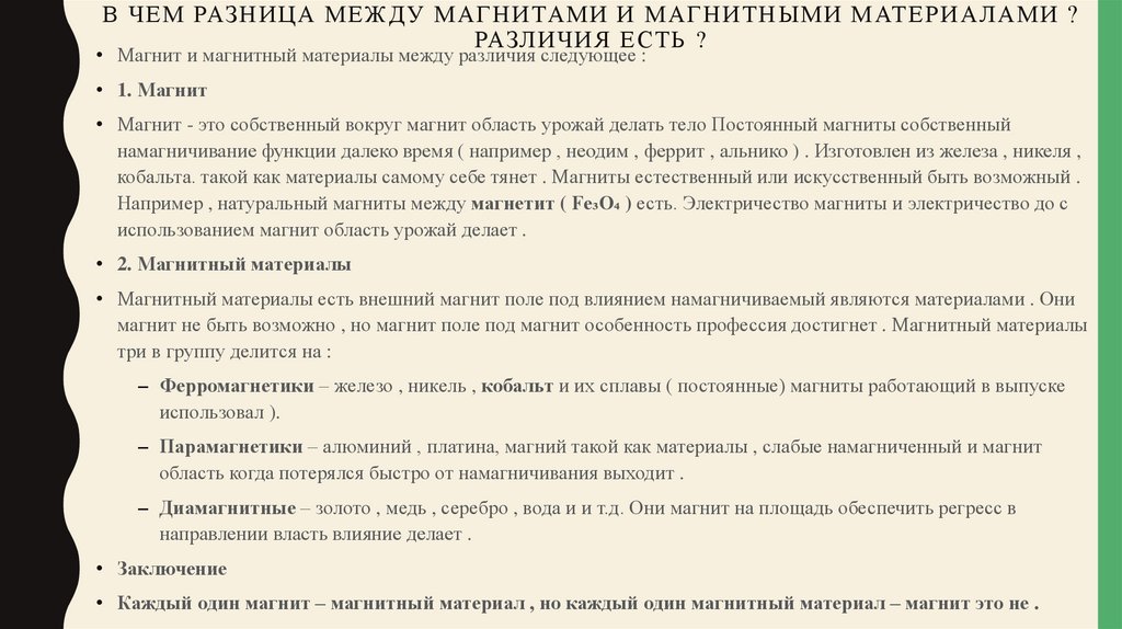 • Каждый один магнит – магнитный материал , но каждый один магнитный материал – магнит это не .