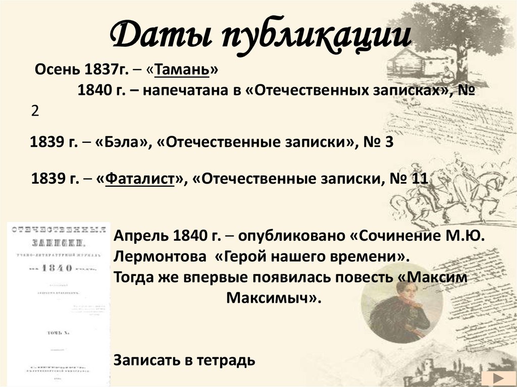 1839 г. – «Бэла», «Отечественные записки», № 3