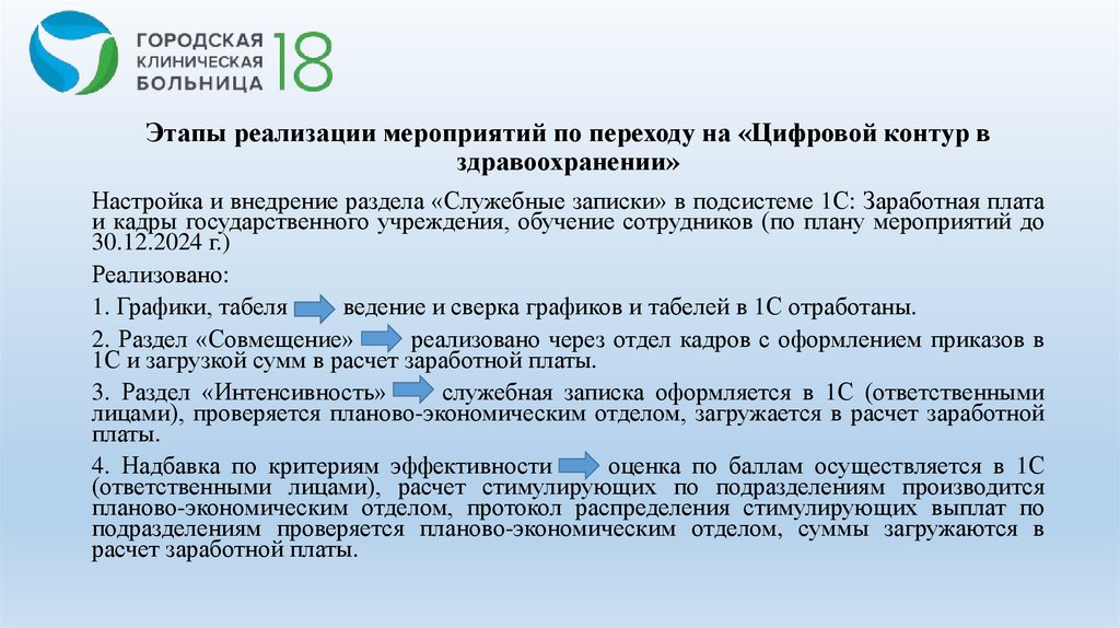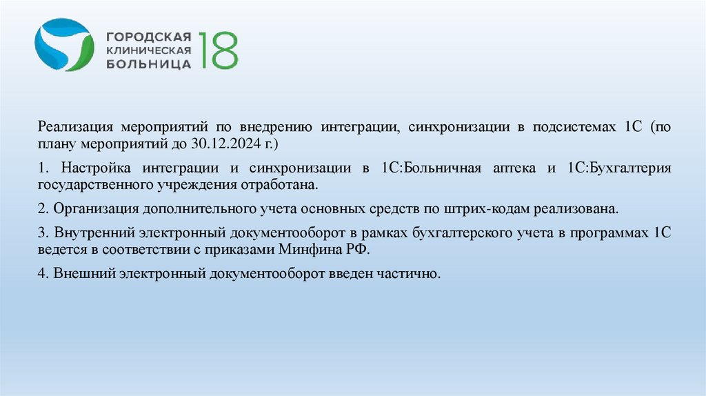 Реализация мероприятий по внедрению интеграции, синхронизации в подсистемах 1С (поплану мероприятий до 30.12.2024 г.)