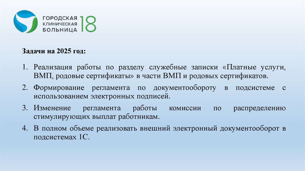 Задачи на 2025 год:1. Реализация работы по разделу служебные записки «Платные услуги,