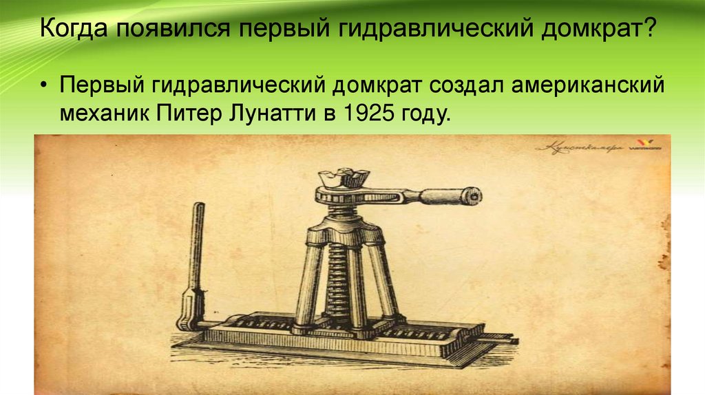 Когда появился первый гидравлический домкрат?• Первый гидравлический домкрат создал американский