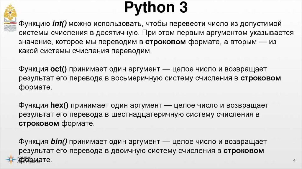 Python 3Функцию int() можно использовать, чтобы перевести число из допустимой