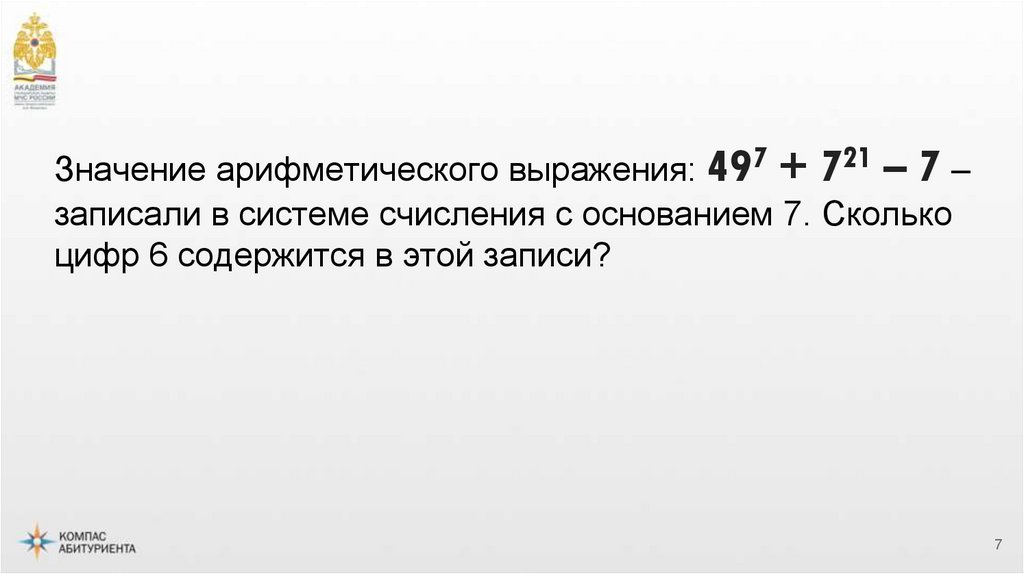 Значение арифметического выражения: 497 + 721 – 7 –записали в системе счисления с основанием 7. Сколько