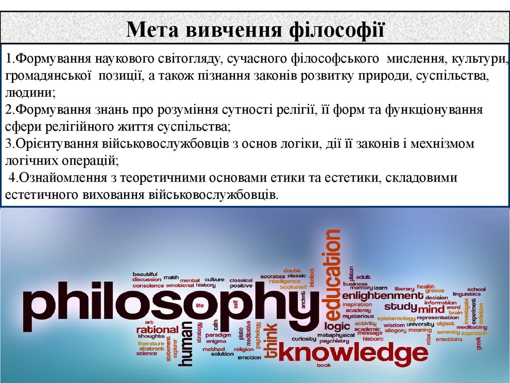 Мета вивчення філософії1.Формування наукового світогляду, сучасного філософського мислення, культури,