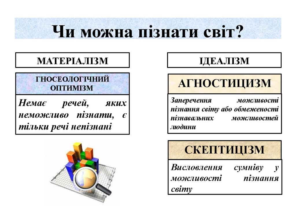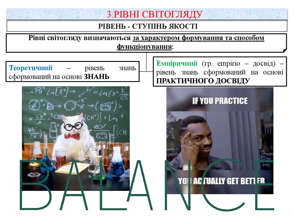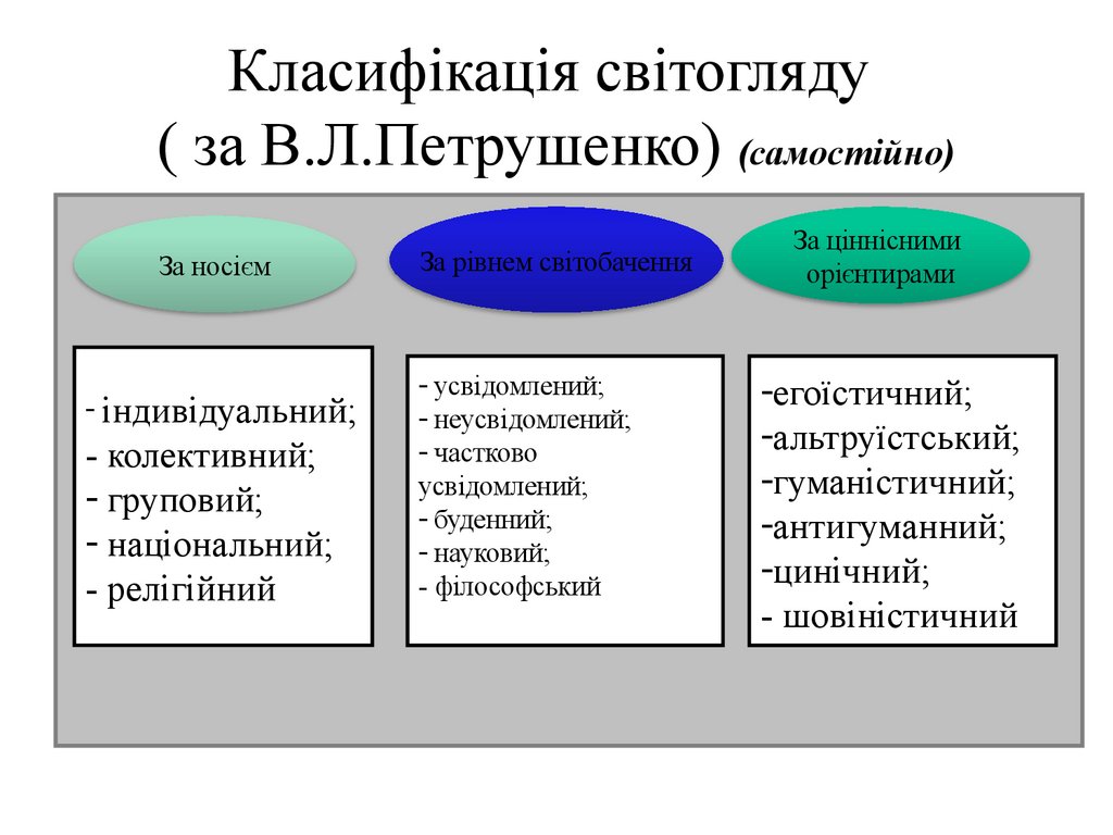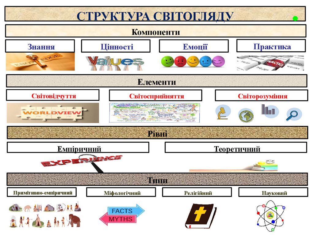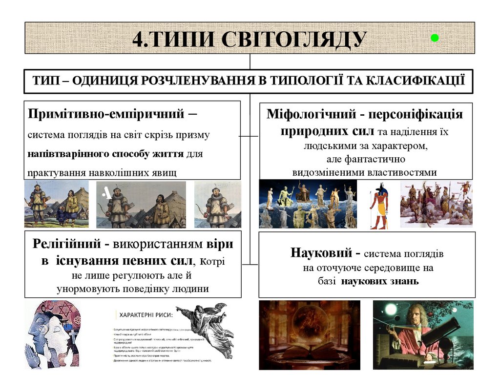світогляду включає в себе примітивноемпірічний, міфологічний, релігійний, науковий (псевдонауковий)