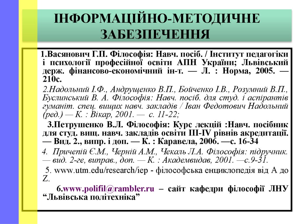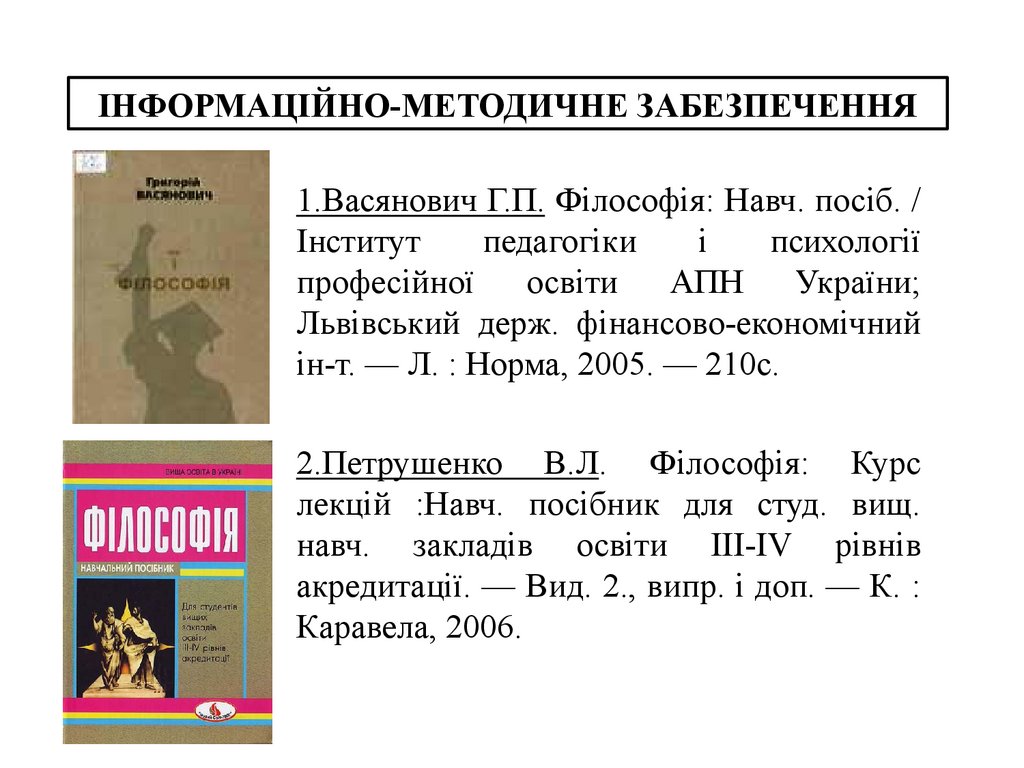 ІНФОРМАЦІЙНО-МЕТОДИЧНЕ ЗАБЕЗПЕЧЕННЯ1.Васянович Г.П. Філософія: Навч. посіб. /