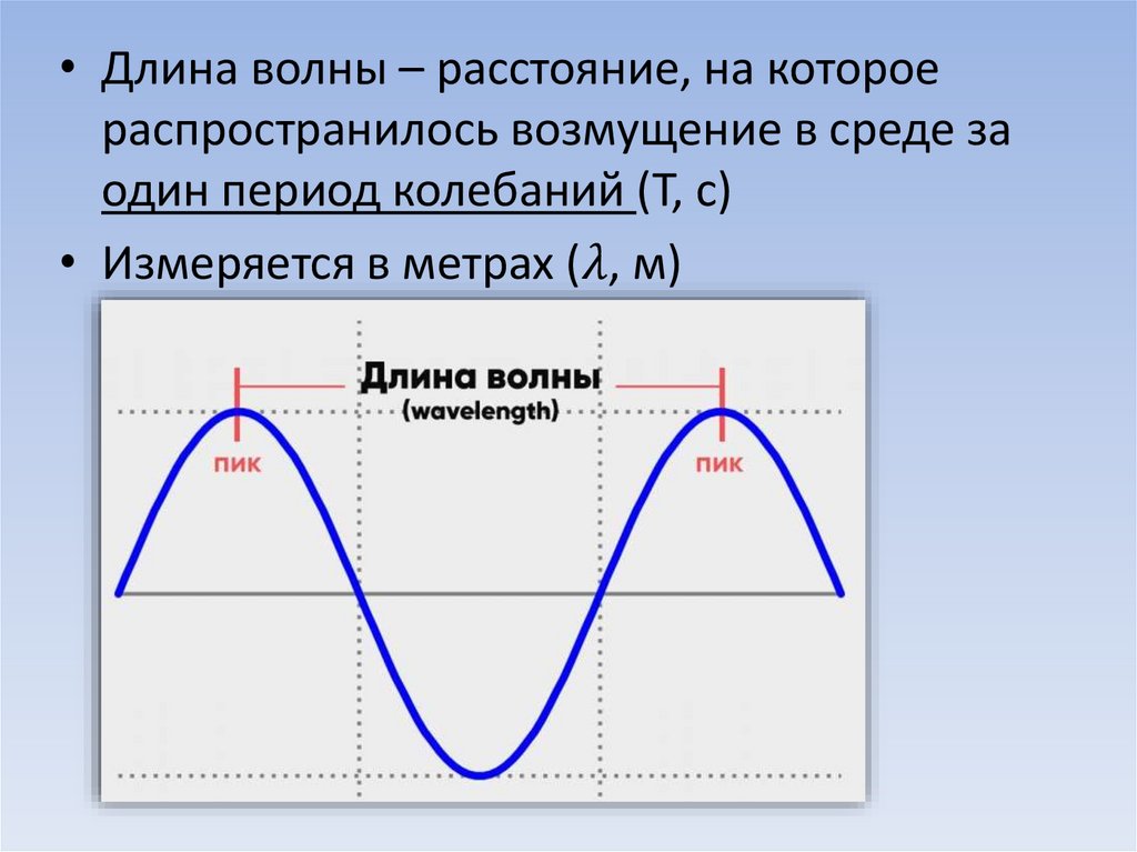 • Длина волны – расстояние, на котороераспространилось возмущение в среде за