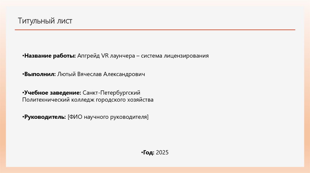 Титульный лист•Название работы: Апгрейд VR лаунчера – система лицензирования