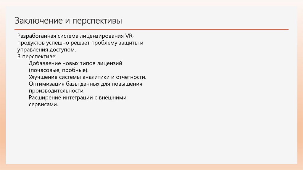 Заключение и перспективыРазработанная система лицензирования VRпродуктов успешно решает проблему защиты и