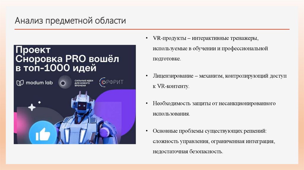 Анализ предметной области• VR-продукты – интерактивные тренажеры,