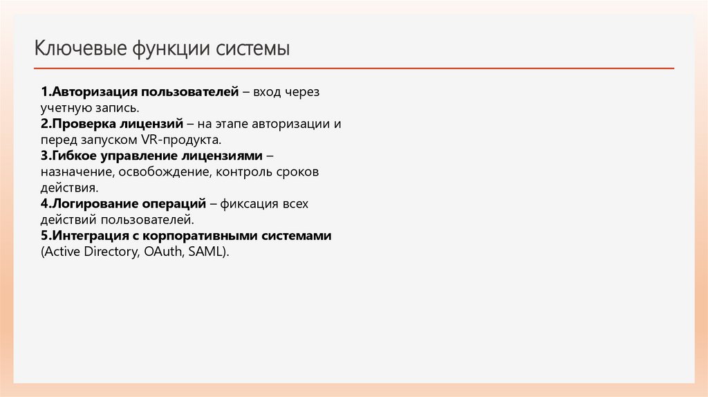 Ключевые функции системы1.Авторизация пользователей – вход через