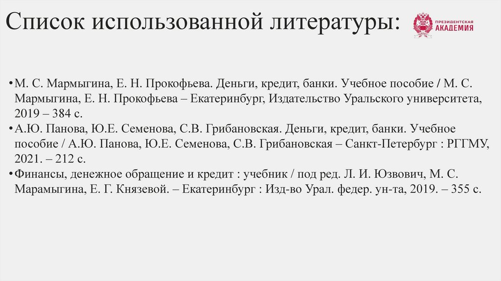 Список использованной литературы:• М. С. Мармыгина, Е. Н. Прокофьева. Деньги, кредит, банки. Учебное пособие / М. С.