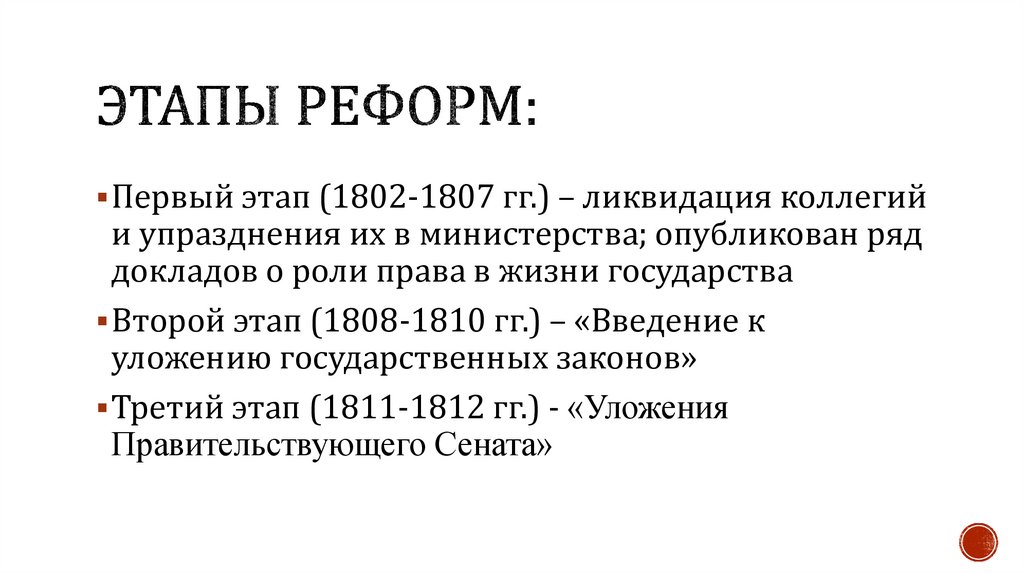 Первый этап (1802-1807 гг.) – ликвидация коллегийи упразднения их в министерства; опубликован ряд