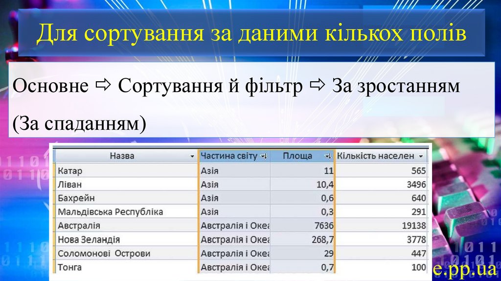Для сортування за даними кількох полівОсновне Сортування й фільтр За зростанням