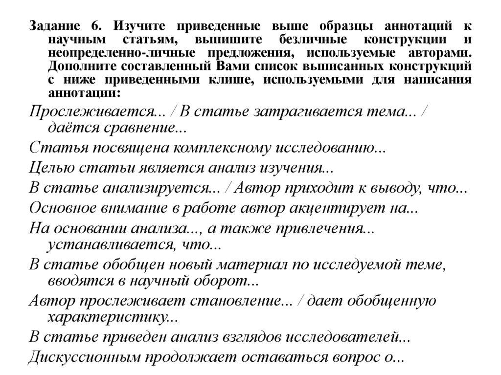 Задание 6. Изучите приведенные выше образцы аннотаций кнаучным статьям, выпишите безличные конструкции и