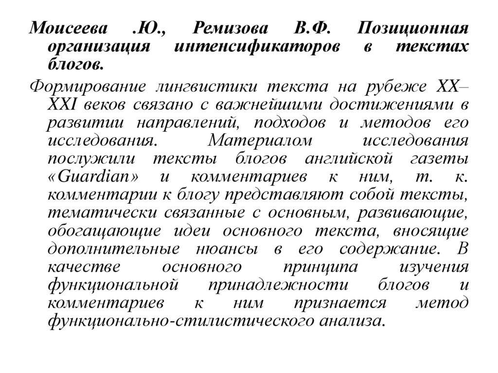 Моисеева .Ю., Ремизова В.Ф. Позиционнаяорганизация интенсификаторов в текстах
