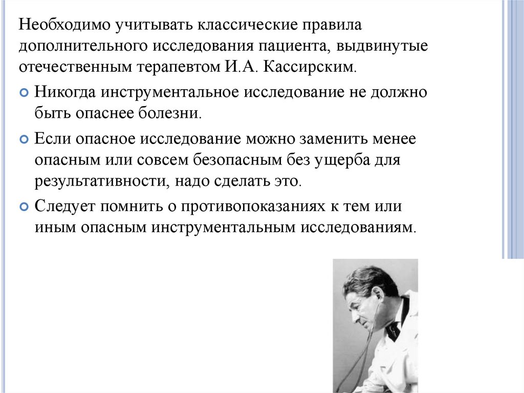 Необходимо учитывать классические правиладополнительного исследования пациента, выдвинутые