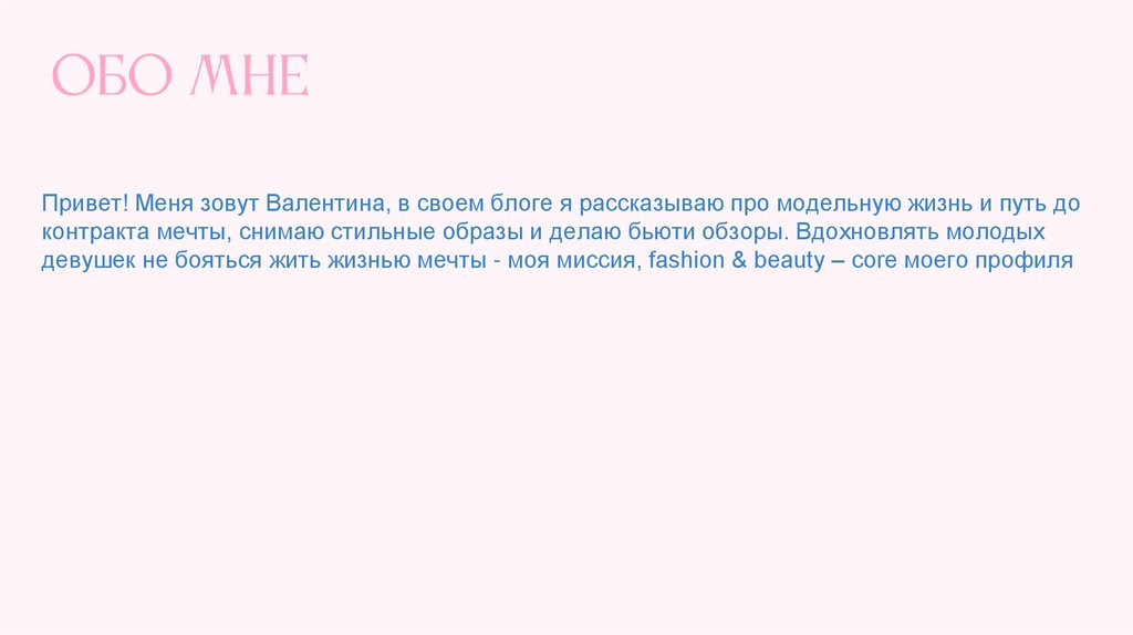 Привет! Меня зовут Валентина, в своем блоге я рассказываю про модельную жизнь и путь доконтракта мечты, снимаю стильные образы и делаю бьюти обзоры. Вдохновлять молодых