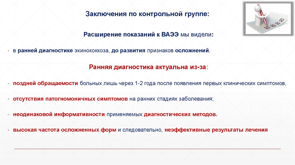 ▪ оценить эффективность диагностических методов раннего выявления эхинококкоза с