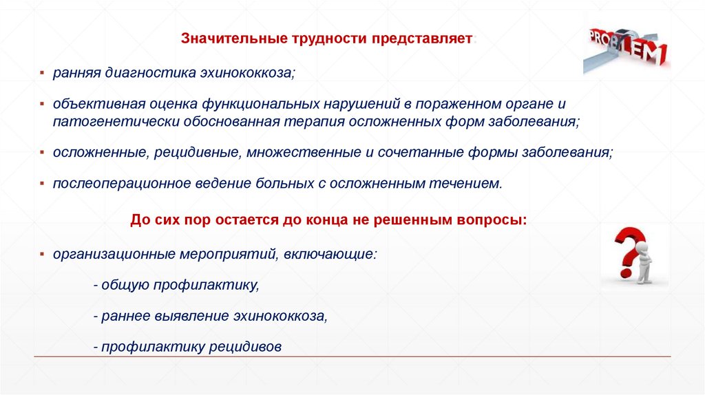Значительные трудности представляет:▪ ранняя диагностика эхинококкоза;