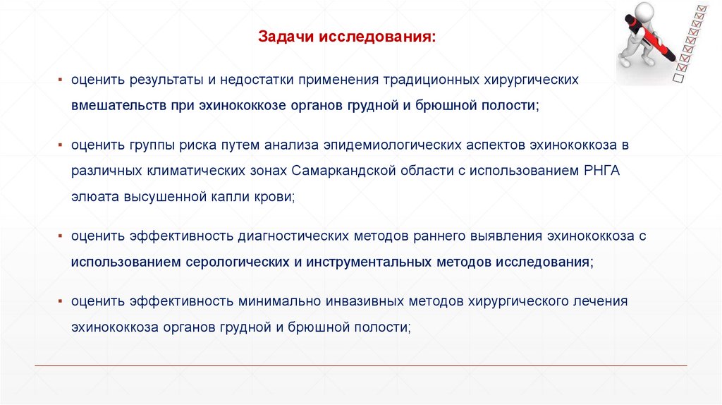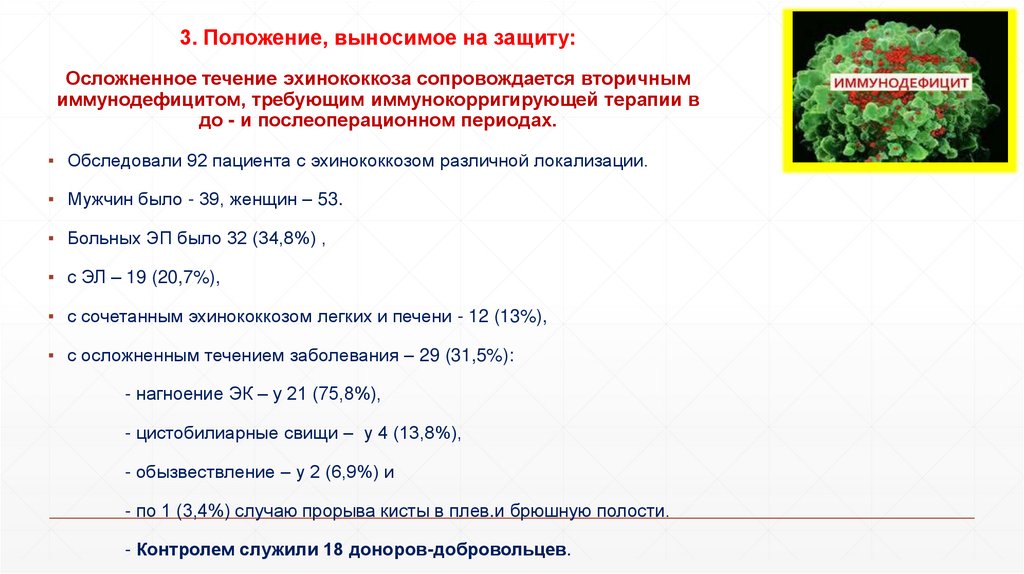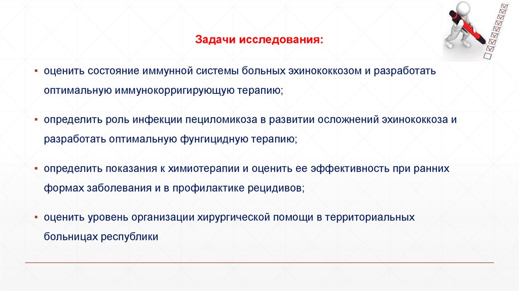 Задачи исследования:▪ оценить состояние иммунной системы больных эхинококкозом и разработать