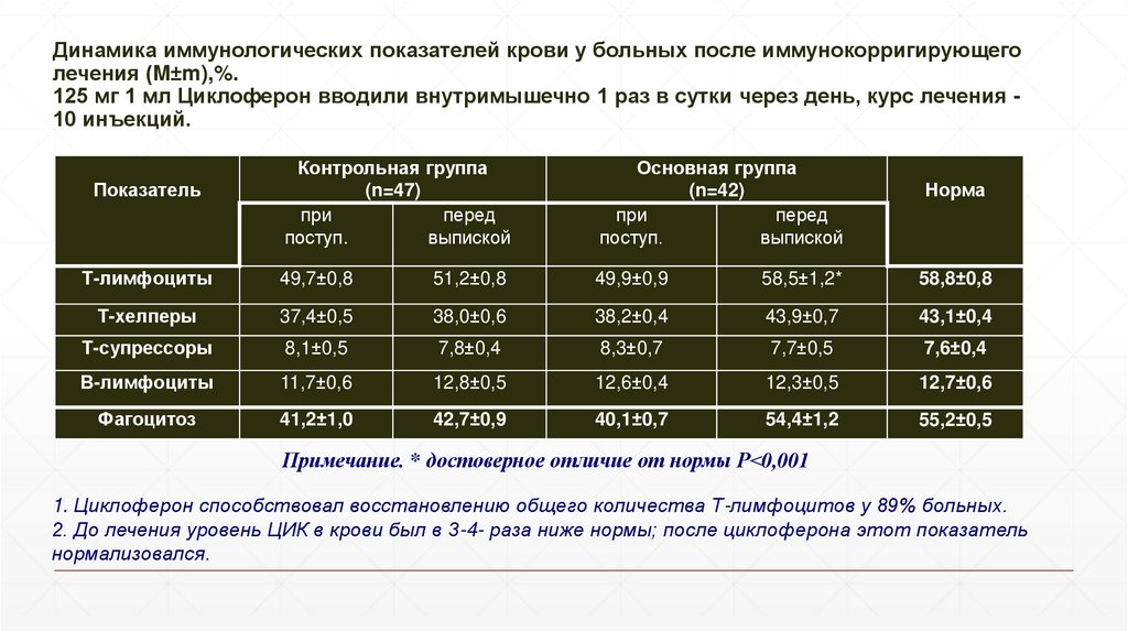 1. Циклоферон способствовал восстановлению общего количества Т-лимфоцитов у 89% больных.