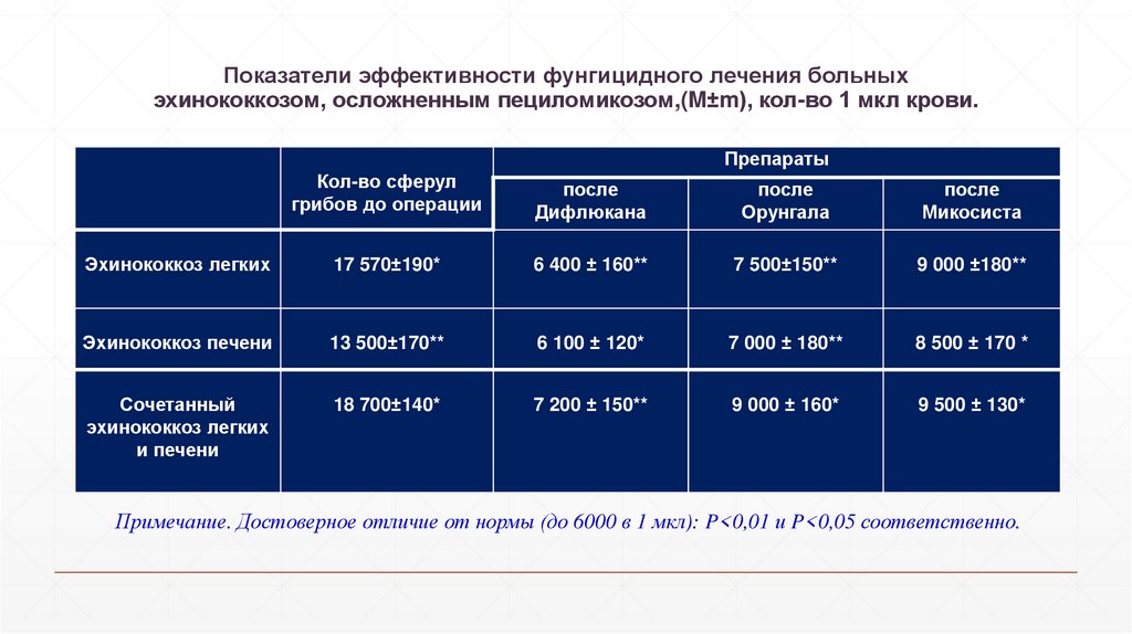 Показатели эффективности фунгицидного лечения больныхэхинококкозом, осложненным пециломикозом,(M±m), кол-во 1 мкл крови.