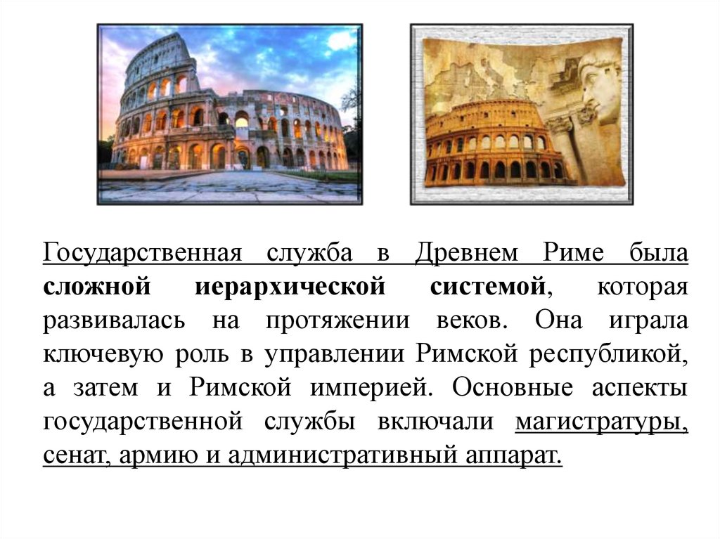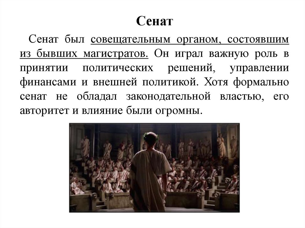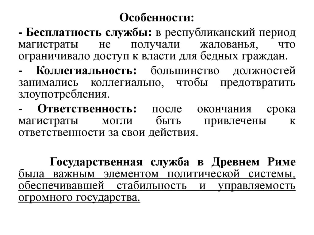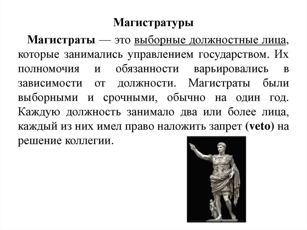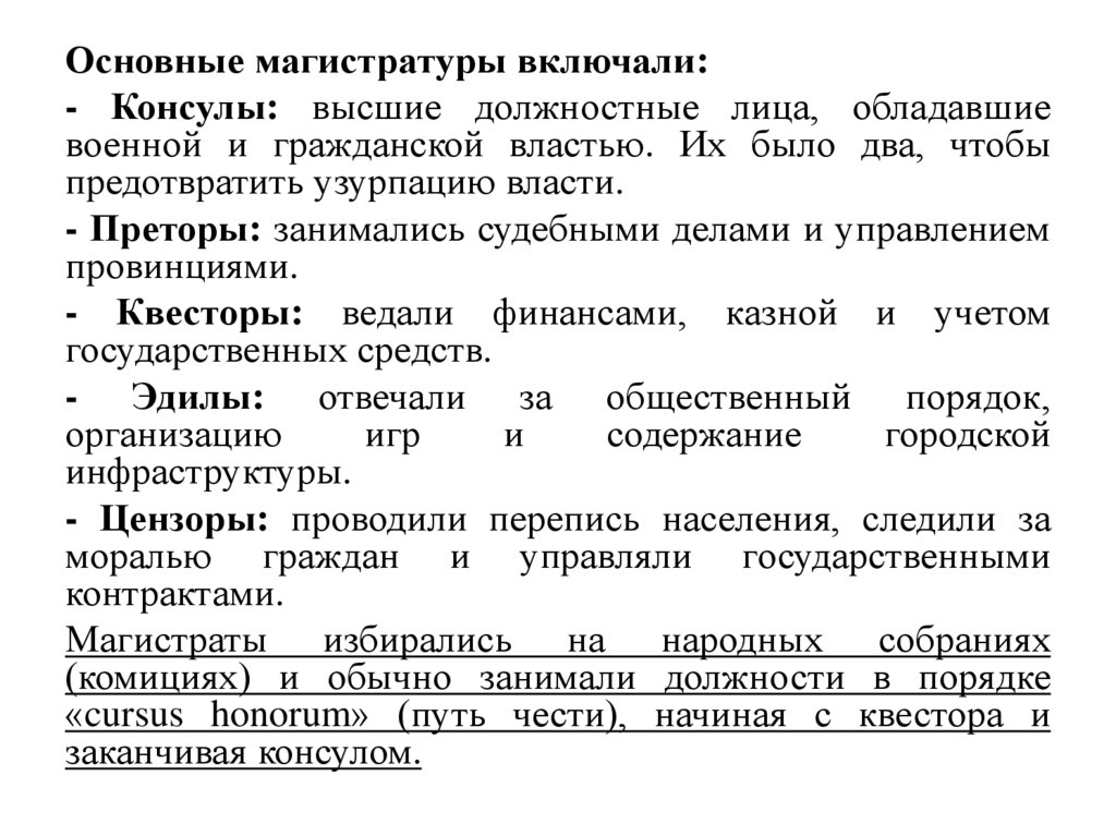 Основные магистратуры включали:- Консулы: высшие должностные лица, обладавшие
