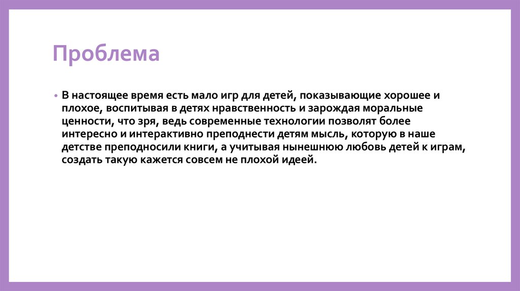 Проблема• В настоящее время есть мало игр для детей, показывающие хорошее и